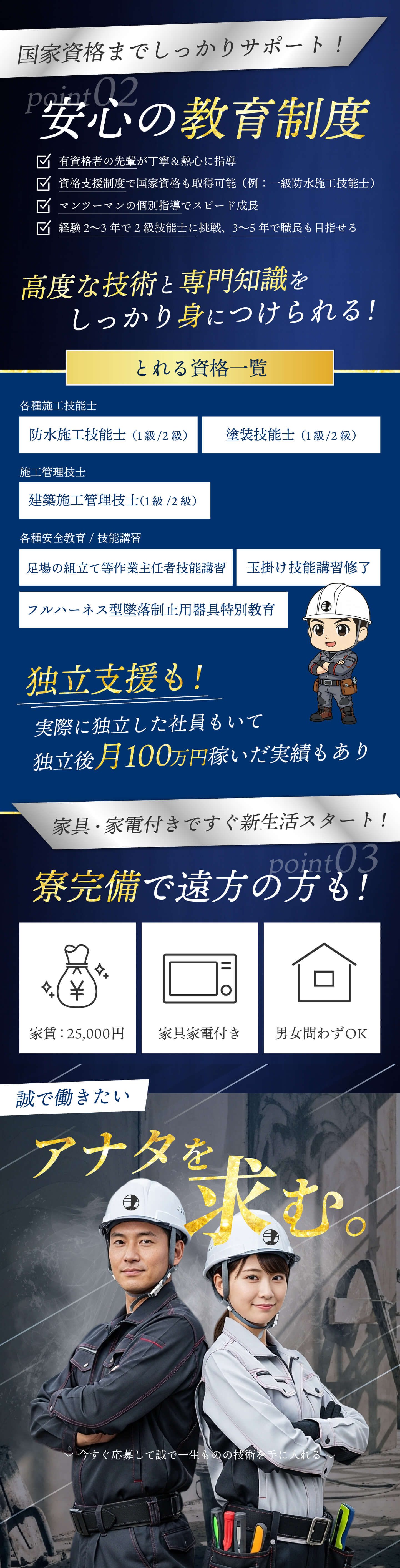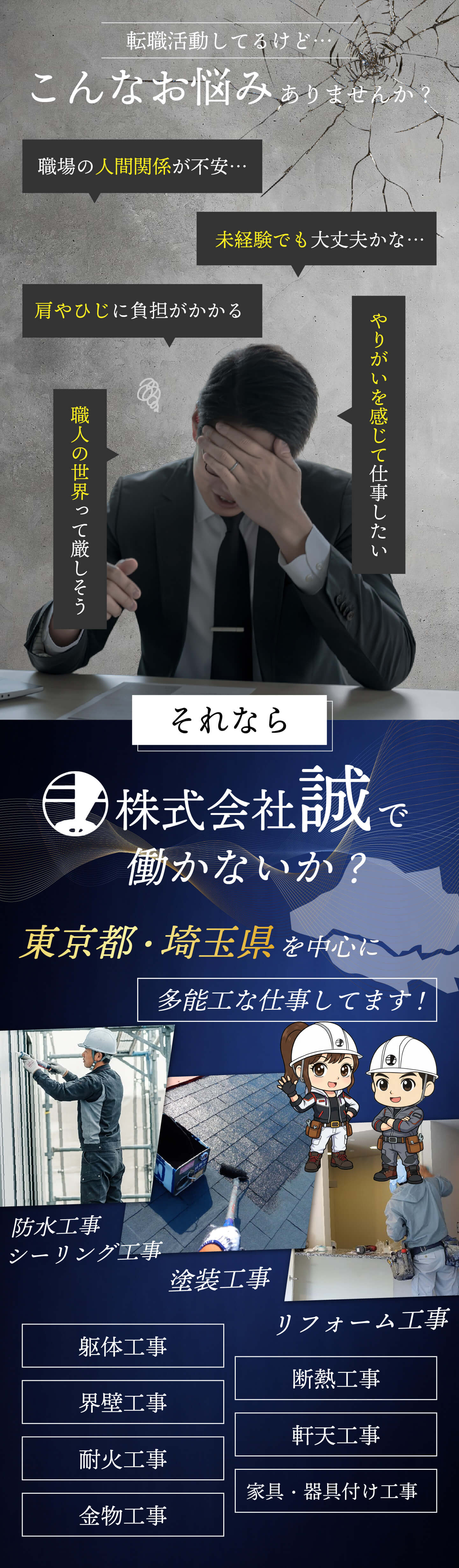 | 事業内容 | 新築工事内装・外装 (躯体・防水・シーリング・吹付・界壁・耐火・断熱・軒天金物器具付け・仕上げシール) リフォーム工事(防水・吹付・樋) 一般新築外装工事請負 一般リフォーム工事請負 |