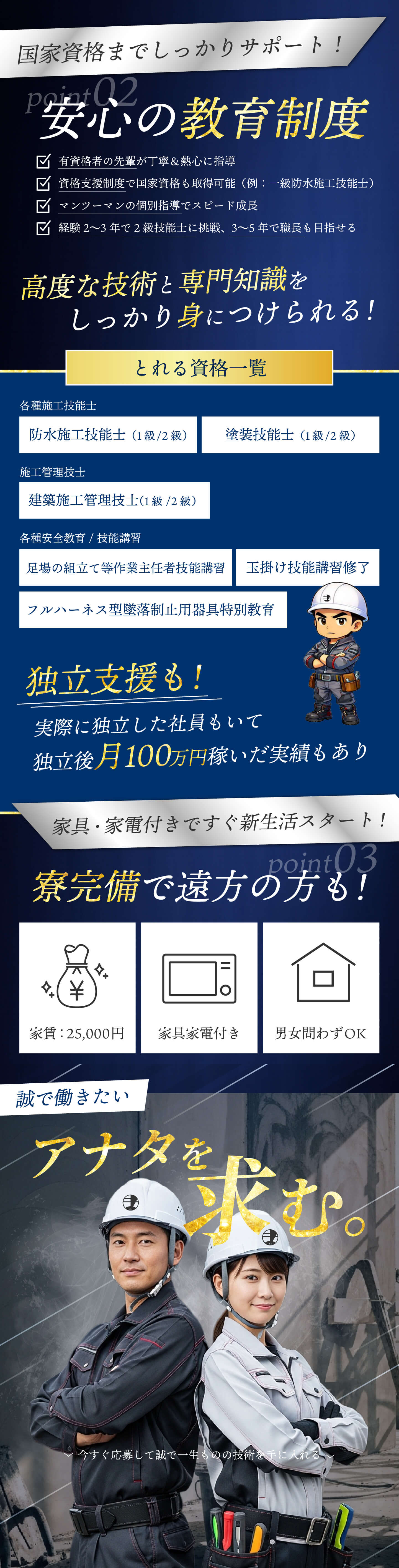 | 事業内容 | 新築工事内装・外装 (躯体・防水・シーリング・吹付・界壁・耐火・断熱・軒天金物器具付け・仕上げシール) リフォーム工事(防水・吹付・樋) 一般新築外装工事請負 一般リフォーム工事請負 |